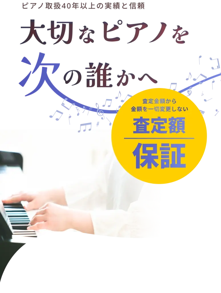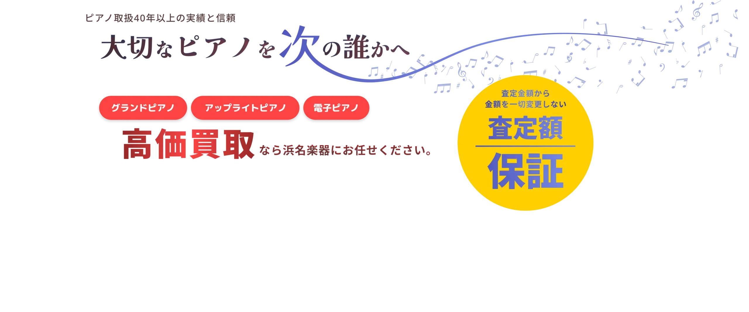今すぐ無料査定 ピアノ買取はどこも同じではありません 浜名楽器が選ばれる理由 当社は二次査定などを一切行わない査定額保証や、 買取•修理•輸出まで自社で一貫して行うことによる高価買取の実現など、他にはない強みで安心と納得の取引をお約束します。 月間取扱台数600台の実績を誇る私たちが、大切なピアノを新しい場所へとつなぐお手伝いをいたします。 お持ちのピアノで こんなお悩みありませんか? 部屋の隅でホコリを被っていて、もう使わない 子どもが成長してから使わなくなったので手放したい 引越するのにピアノを処分したい 新機種・本格的なピアノに買い換えたい 粗大ゴミ処分業者に依頼したら処分料が高かった どこに処分を頼めば良いか分からずずっと放置している 浜名楽器のピアノ買取なら! 査定額から金額が変わらない 見積もり保証 ピアノ買取でよくある不安が、「引き取り時に査定額が下がってしまうのでは?」という点です。 当社ではその不安を解消するために 買取価格保証制度 を導入しています。 一度お伝えした査定額は最後まで保証し 2次査定や追加減額は一切ありません。 大切なピアノを安心してお任せいただけるよう、誠実で透明性のある取引をお約束いたします。 ※水濡れ、火災被害、足の破損は対象外となります。 査定・見積もりは もちろん無料です! ピアノを売りたいと思っても、 査定にお金がかかるのでは? と不安に感じる方も多いかもしれません。 当社ではそのような心配は一切不要です 査定・見積もりは完全無料で、全国どこからでもお申し込みいただけます。 もちろん、査定を受けたからといって必ず売却する必要はありません。 「まずは金額を知りたい」という方も安心してご利用ください。 大切なピアノの価値を、無料で丁寧に査定いたします。 安心の現金買取 お引き取り当日そのまま現金でお支払いいたします。振込を待たずに安心して取引を完了できる、スピーディーで透明性のある対応が当社の強みです。 ネットで簡単申し込み 面倒な手続きは不要。パソコンやスマホから必要事項を入力するだけで、簡単に査定をお申し込みいただけます。電話一本でも手軽に査定が可能です。 日本全国対応 浜名楽器の信頼と実績を活かし、関東を中心に全国どこでも買取・引取に伺います。 ※北海道・沖縄・一部地域を除く。 簡単・安心の買取ステップ パソコンやスマートフォンから、フォームに必要事項を入力するだけで簡単に査定をお申し込みいただけます。フォームからのお申し込みは24時間可能。電話1本、簡単な必要事項の入力だけでも手軽にご利用いただけます。 面倒な手続きは一切不要! 直近の買取実績 グランドピアノ YAMAHA もっと見る CLP635WA 2023年4月 東京都内にお住まいのA様より、ヤマハのアップライトピアノを買取させてい・・・>> グランドピアノ YAMAHA もっと見る CLP635WA 2023年4月 東京都内にお住まいのA様より、ヤマハのアップライトピアノを買取させてい・・・>> グランドピアノ YAMAHA もっと見る CLP635WA 2023年4月 東京都内にお住まいのA様より、ヤマハのアップライトピアノを買取させてい・・・>> グランドピアノ YAMAHA もっと見る CLP635WA 2023年4月 東京都内にお住まいのA様より、ヤマハのアップライトピアノを買取させてい・・・>> グランドピアノ YAMAHA もっと見る CLP635WA 2023年4月 東京都内にお住まいのA様より、ヤマハのアップライトピアノを買取させてい・・・>> グランドピアノ YAMAHA もっと見る CLP635WA 2023年4月 東京都内にお住まいのA様より、ヤマハのアップライトピアノを買取させてい・・・>> 詳しくはこちら お客様の声 吾輩は猫である。名前はまだない。どこで生れたか頓と見当がつかぬ。何でも薄暗いじめじめした所でニャーニャー泣いていた事だけは記憶している。 吾輩は猫である。名前はまだない。どこで生れたか頓と見当がつかぬ。何でも薄暗いじめじめした所でニャーニャー泣いていた事だけは記憶している。 吾輩は猫である。名前はまだない。どこで生れたか頓と見当がつかぬ。何でも薄暗いじめじめした所でニャーニャー泣いていた事だけは記憶している。 吾輩は猫である。名前はまだない。どこで生れたか頓と見当がつかぬ。何でも薄暗いじめじめした所でニャーニャー泣いていた事だけは記憶している。 よくある質問 詳しくはこちら Q. 古いピアノでも買取可能ですか? Q. 古いピアノでも買取可能ですか? Q. 古いピアノでも買取可能ですか? ピアノ簡易基礎知識集 ピアノに関する用語や豆知識をまとめたコンテンツをご用意しました アコースティックピアノとは? サイドペアリングとは? 詳しくはこちら 今すぐ無料査定